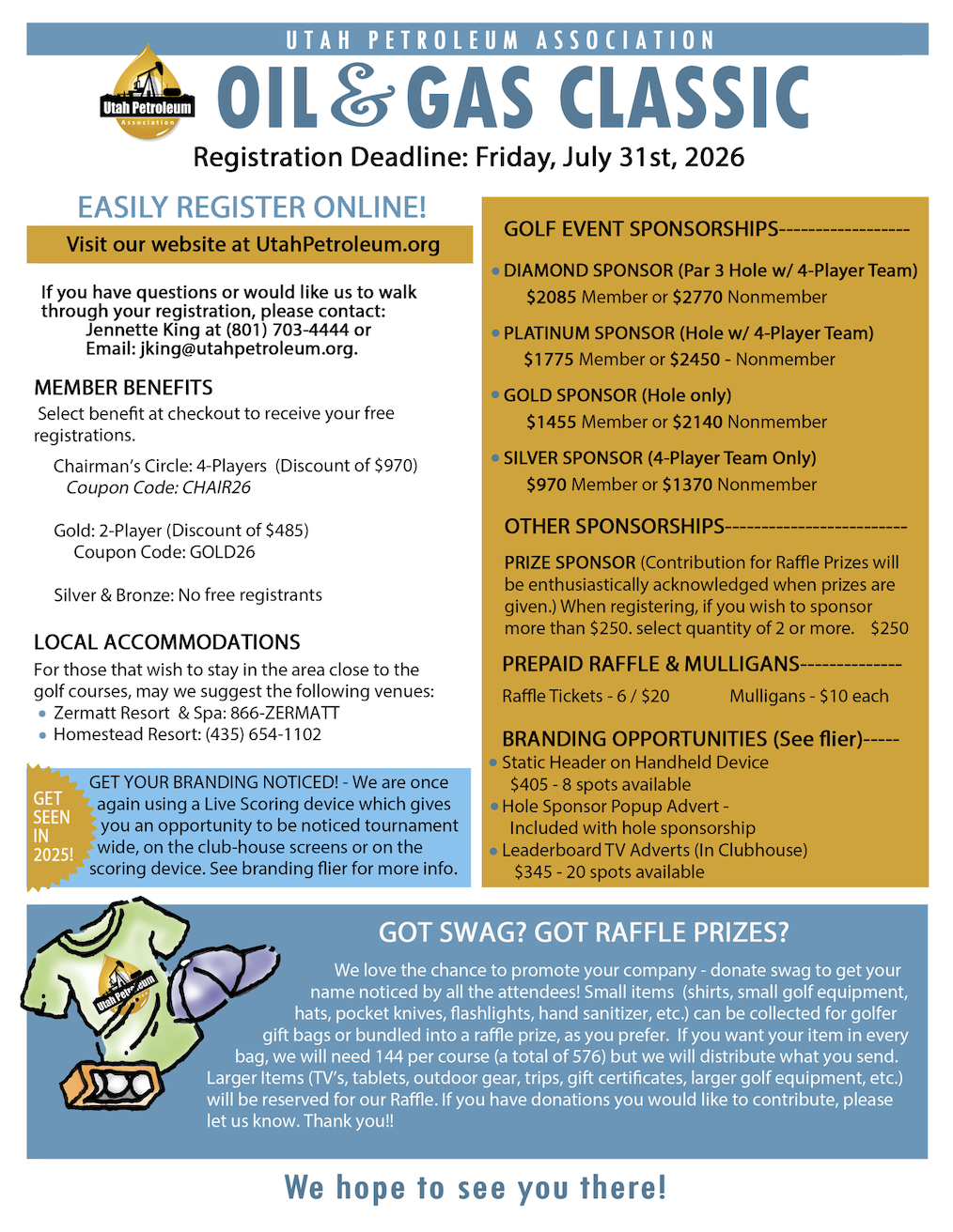 Join us for the UPA Oil & Gas Classic! Come enjoy a beautiful day of golf and meet some new industry friends and promote your business. Do not miss our most attended event of the year! We have streamlined registration so that you can easily register and pay online. If you would like to discuss options or have questions when registering, please contact Jennette at 801-703-4444 and she will be happy to walk through it with you. We are golfing on both courses at Soldier Hollow and both courses at Wasatch Mountain. Every hole is available for sponsors and have two teams of 4 starting on each hole. August 6, 2026 - Soldier Hollow and Wasatch Mountain Golf Courses (Go directly to the course that you are playing or sponsoring.) DIAMOND SPONSOR PLATINUM SPONSOR GOLD SPONSOR SILVER SPONSOR Tournament lunch will be at the Soldier Hollow Golf Course after play (approx. 2:00 pm). If you are playing at Wasatch Mtn. course, please make your way over to Soldier Hollow for the lunch, awards and raffle prizes.