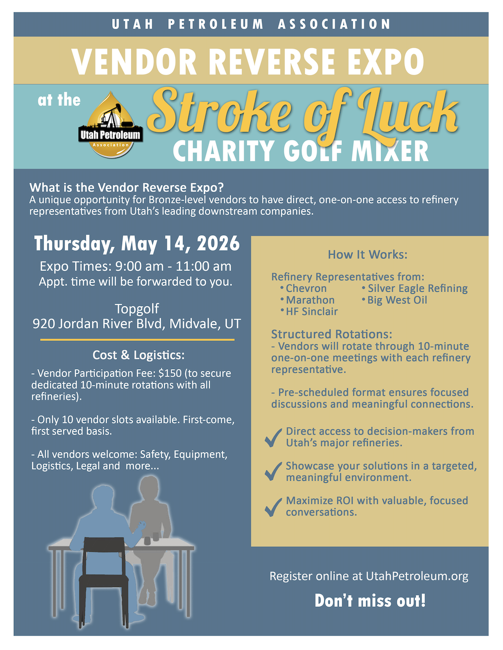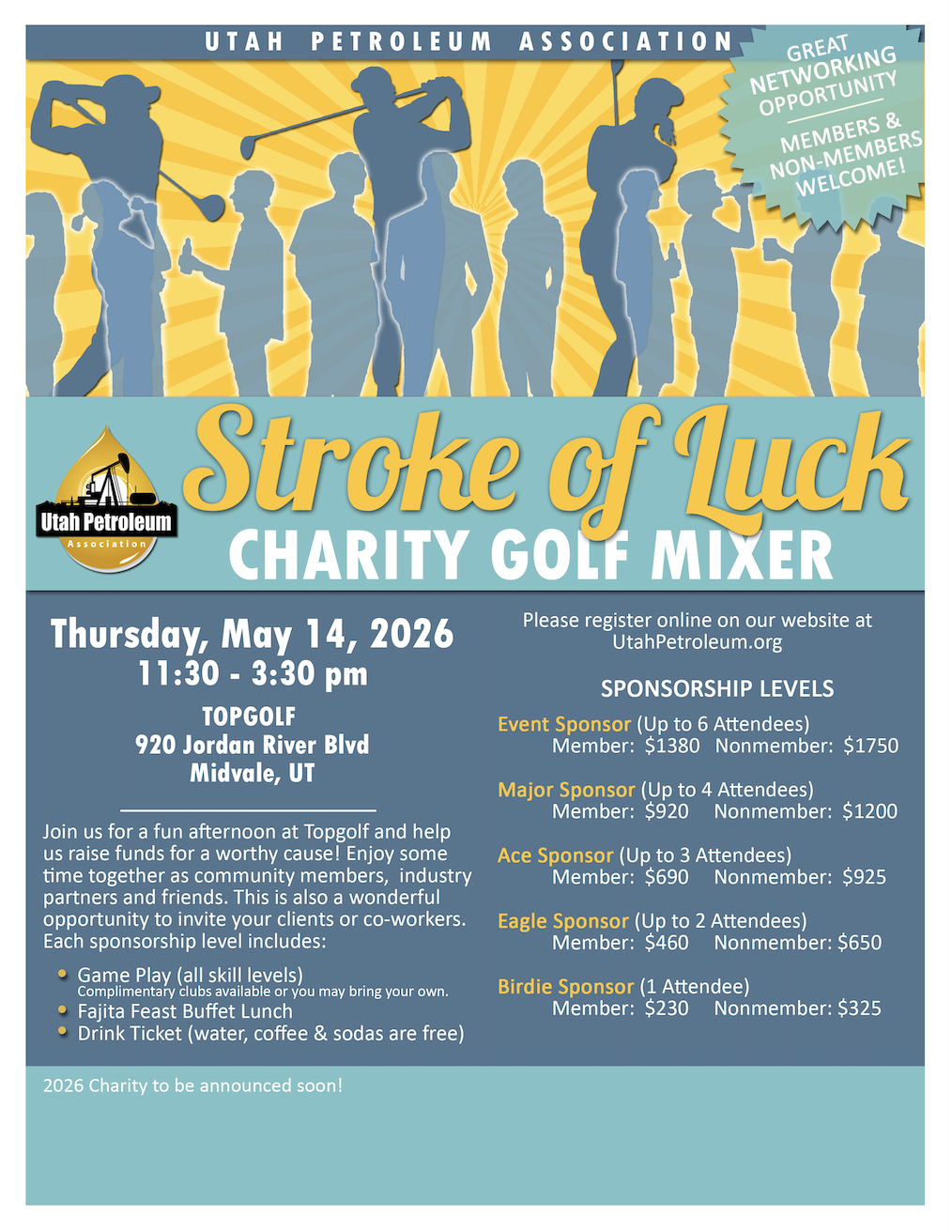 We hope you'll join us for the UPA Stroke of Luck Charity Golf Mixer on May 15th! Enjoy time together as community members, industry partners and friends. Bring clients or co-workers to Topgolf and enjoy an afternoon playing a little golf, having lunch and contributing to a worthy cause! Golf play is for all skill levels- so both beginners and experts will have fun. You can use complimentary clubs provided or bring your own. We certainly hope to see you there! Charity recipient for 2026 to be announced shortly. SPONSORSHIP LEVELS Event Sponsor (Up to 6 Attendees) Major Sponsor (Up to 4 Attendees) Ace Sponsor (Up to 3 Attendees) Start time - 11:30 am